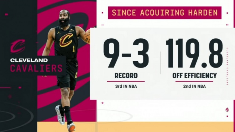 哈登加盟以来骑士战绩9-3期间联盟第三 进攻效率119.8联盟第二!